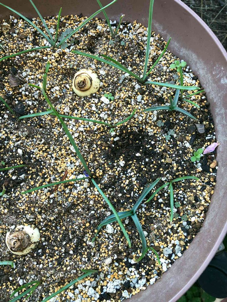 令和2年12月1日 (火)( ^∀^)🌱おはよーございます♪ 小さい庭の朝の見廻りしています。 いよいよ師走の12月 テレビを見て年末年始スーパーの買い物は計画的にと❣️計画的に出来なかった球根の植え付けムスカリ以外の葉っぱが🌱👀 原種チューリップ🌷かな? 溶けてたからなぁ....