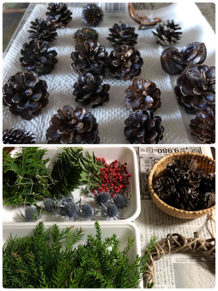 昨日、裏山へクリスマスリースの材料を集めに、、ウォーキング途中、センリョウの実をもらって、、松ぼっくり他の実はシルバーを塗って、準備は出来ました、今日は作ってみようかな😄