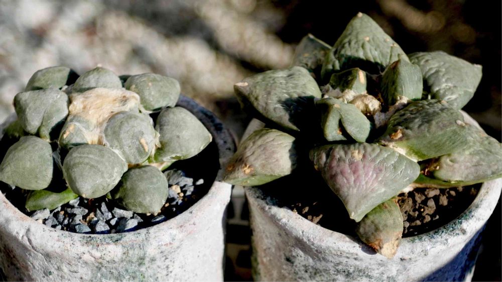 左のプックリ丸っこいのが三ッ疣花牡丹