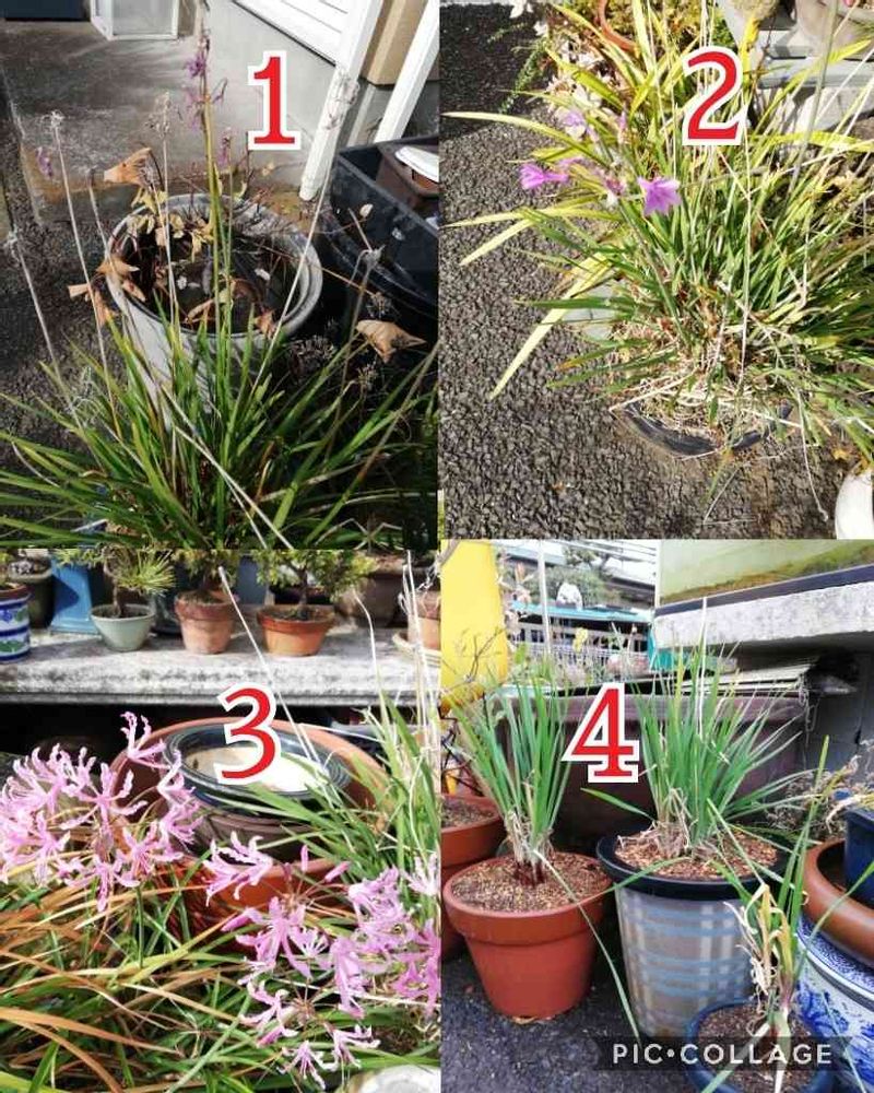 一番は 花が完全に枯れています 2番は かろうじて残っています 3番は まだまだ更新中 4番 花が終わったもの 株分けしました♪