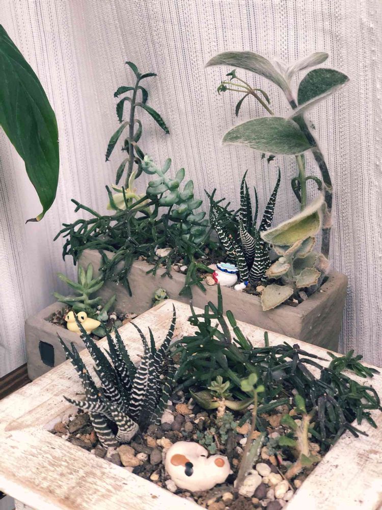 夏越しの痩せているものが寄せ合い、見た目を気にしないでできたもの、チョ〜恥ずかしいです。置き物に助けられていた😊今年はあまり多肉に気を遣っていません、伸び放題です😜