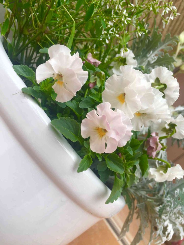 白の寄せ植え鉢の日日草からフリルビオラさんに変更☘️可愛い〜
