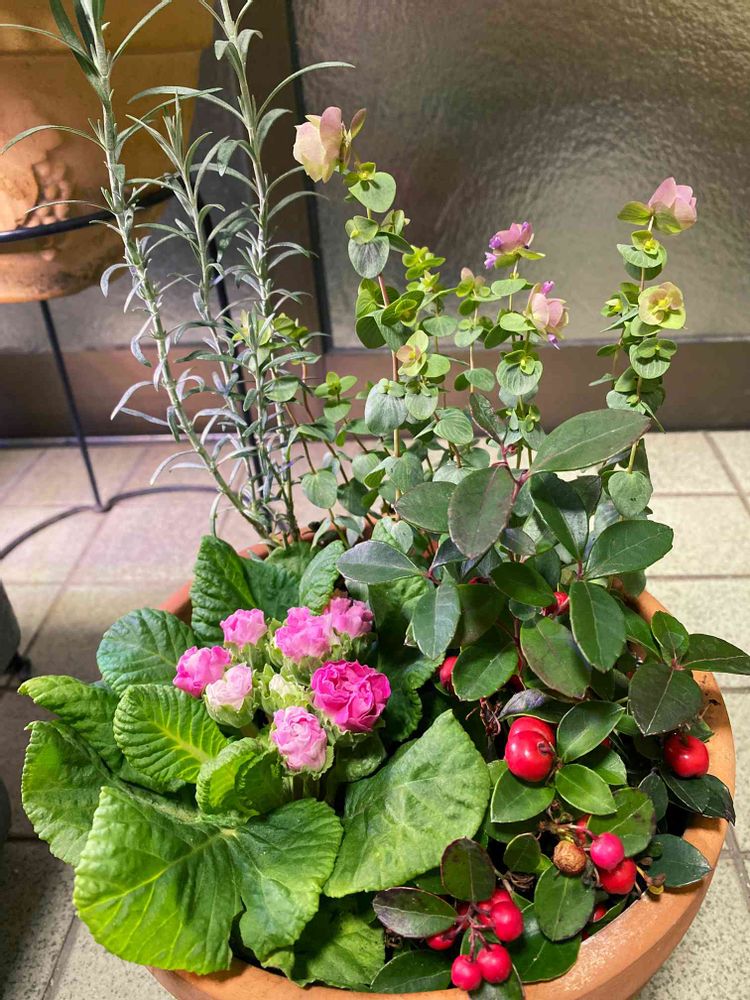 バラ咲きジュリアン探してたんです💕チェッカーベリーもオレガノケントビューティーも、ずっと憧れてました❣️好きなものばかりの鉢になりました🌸