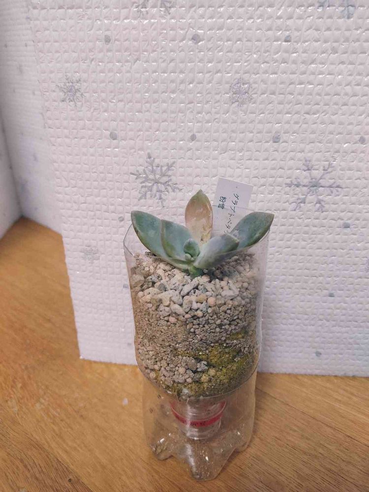 粉雪さん、風通しに問題あり、鉢の中も根が絡みカチカチでした。適当な鉢がないのでまずペットボトルに植え替えました。部屋の空気対策はこれから考えます。
