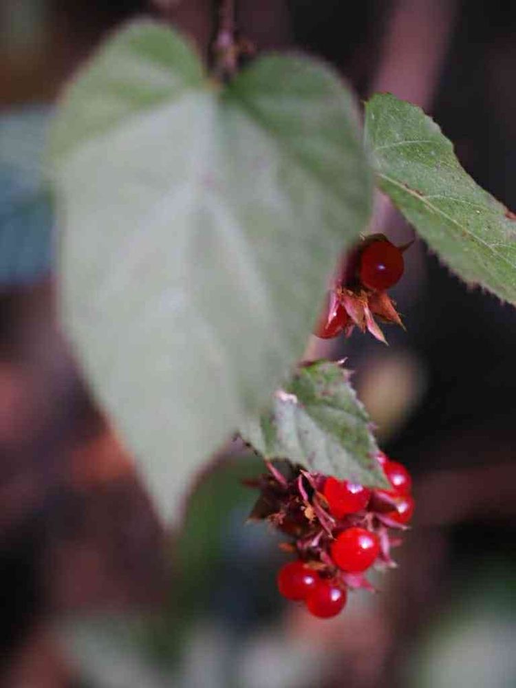 ルビーの様に美しいミヤマフユイチゴの輝く実。