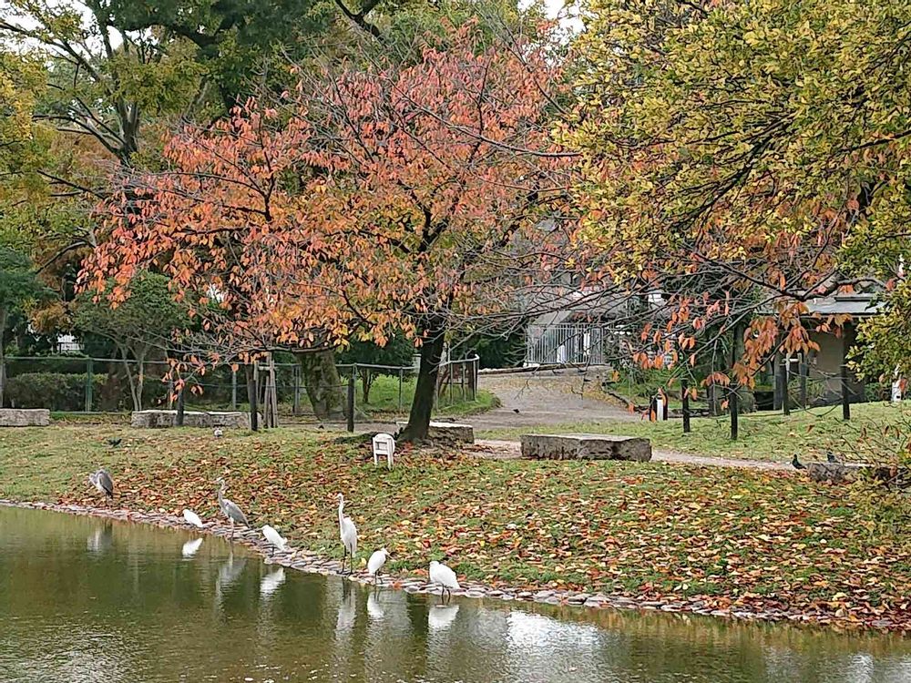 もみじの下で 白鷺やアオサギが たくさん休憩していました💕