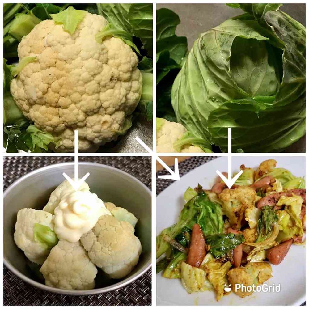 今夜は、昨日採りのカリフラワーとキャベツの日。茹でマヨ&マヨ・ケチャ・カレー炒め^_^。Wマヨ👍。