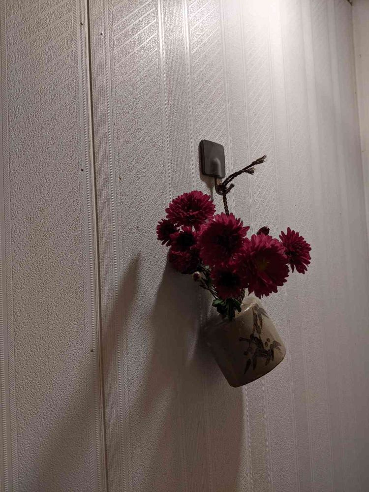 LED白熱電球の灯りと、一輪挿しに、三輪ざしの小菊。