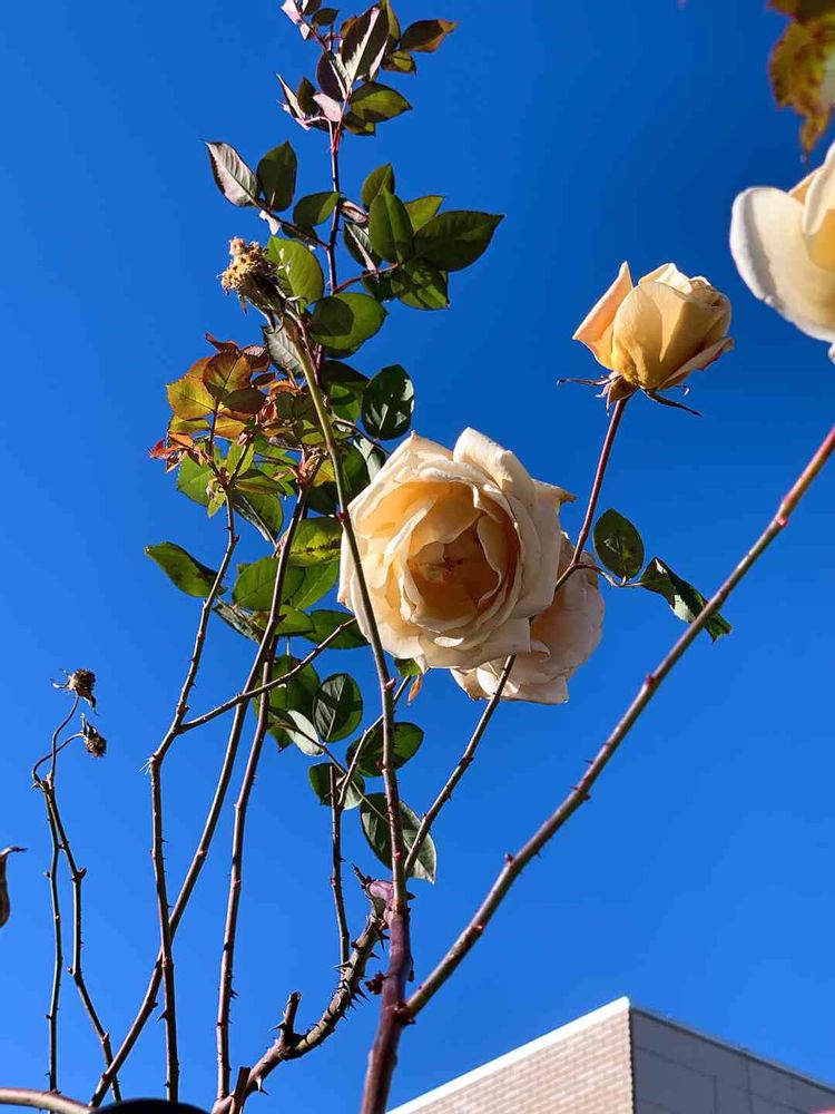 青空にバラ🌹葉っぱは少なくなりましたが。とっても素敵でした。