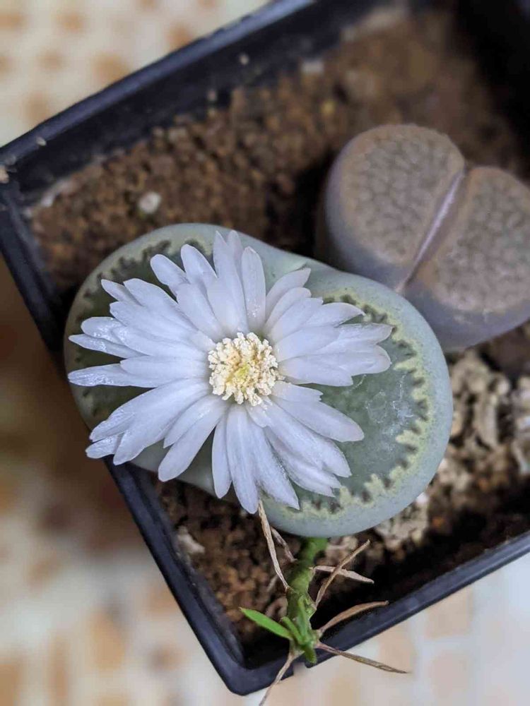 リトープスさん、珍しい外観とは違って、白い可憐な花を咲かせるんですよね。😍👍