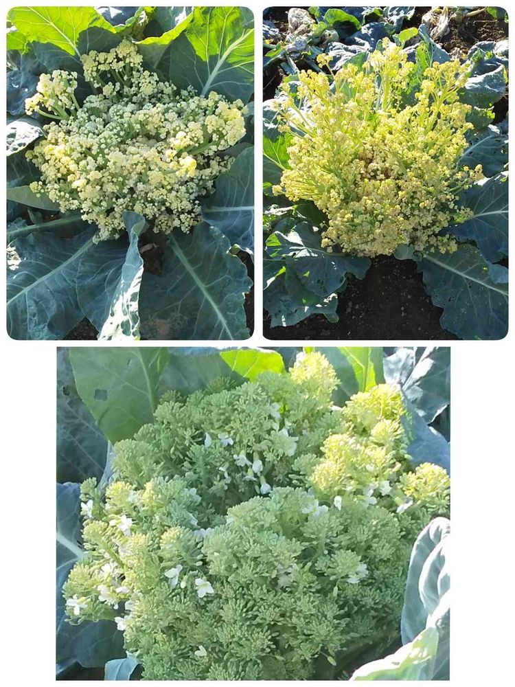 広いカリフラワーの畑に、育ち過ぎて出荷できないカリフラワーが所々残されています。花になっているようです。