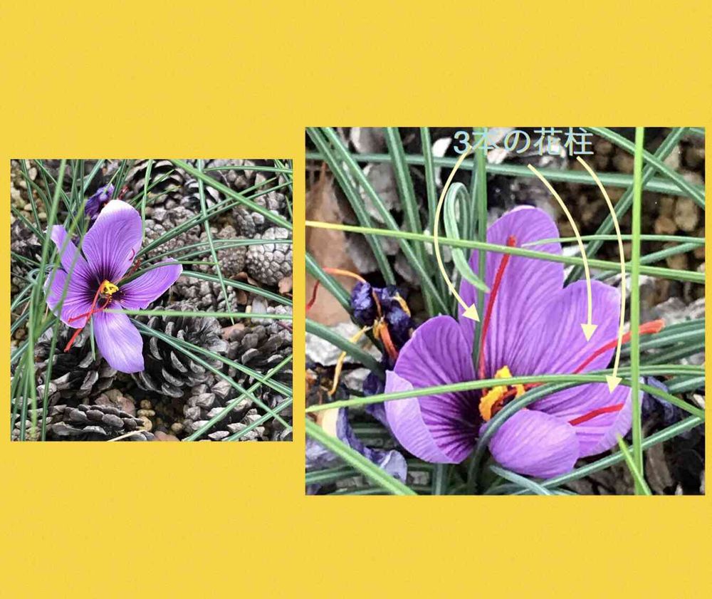 サフランは、秋咲きのアヤメ科のクロッカスの一種で染料、香料、薬用として栽培され、今は観賞用としても利用されています。料理に使われているサフランは、その花の3本の花柱を抜き取って乾燥させたものです。