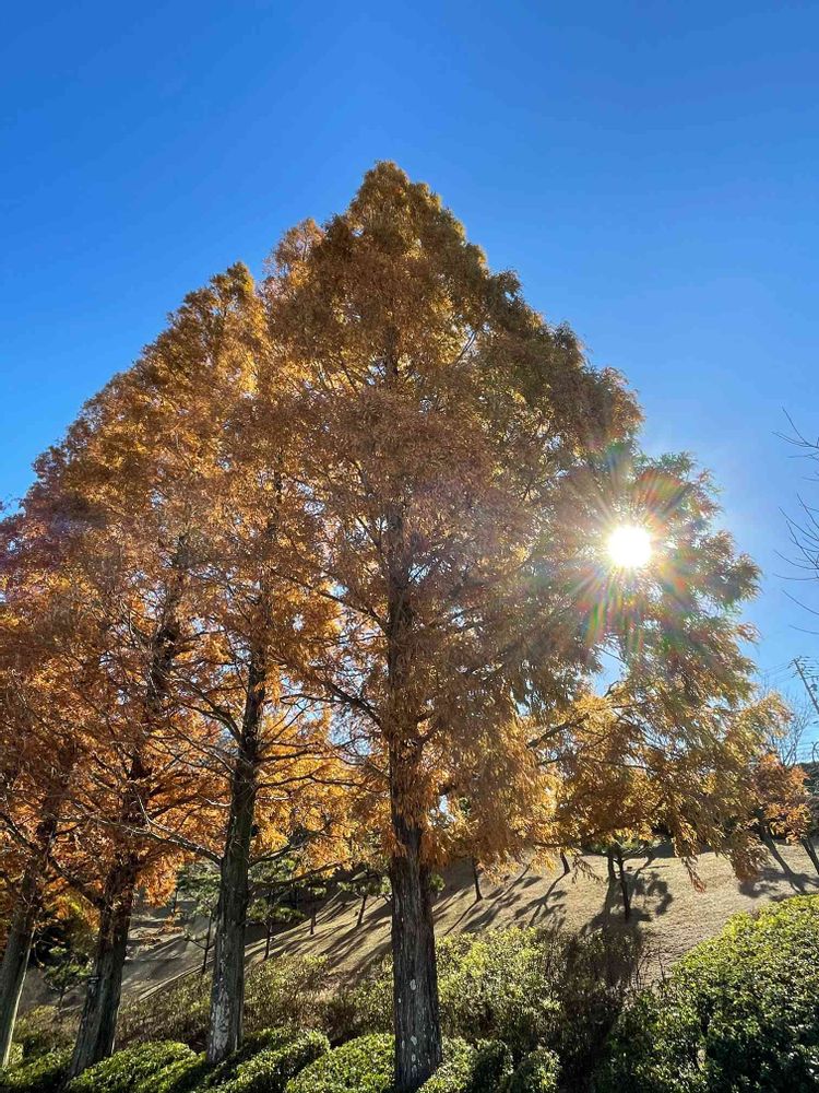 透きとおった青空に雄大なメタセコイヤの隙間から降り注ぐ太陽の光✴️✨