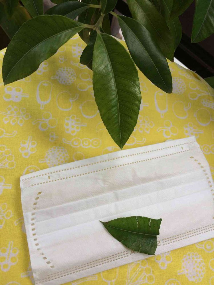 レモンマートルの葉を半分とか 3分の1 ほどちぎり、手で切り込みを適当に入れて マスクにしのばせる✨
