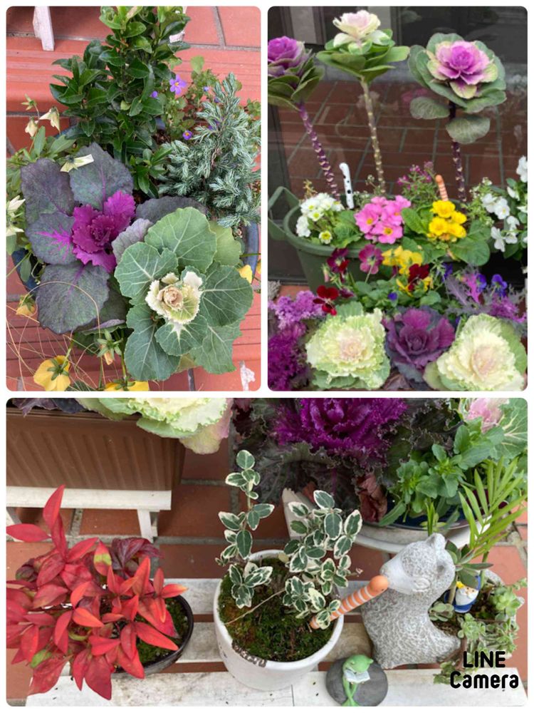 マサキ、プリムラ、ビオラとの寄植えです。バコパも何とか咲いてますよー(^。^)