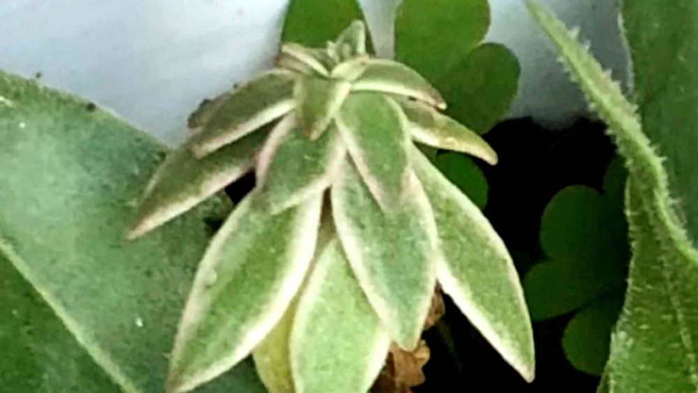 Google先生だと多肉植物か観葉植物、あるいは全く似てない草木の候補が上がってきます。背後に小さめのカタバミの葉が見えるので、それで大きさをお察しください。