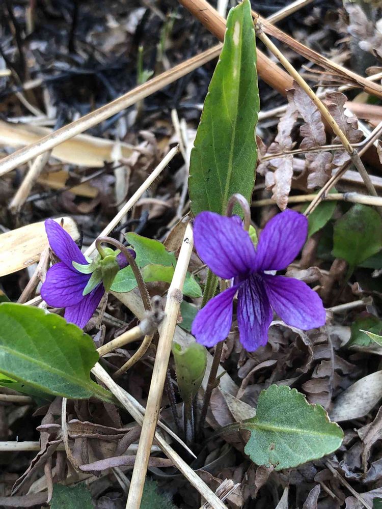 葉の形状は細長く、葉柄に翼が見られ、スミレに特徴的です。