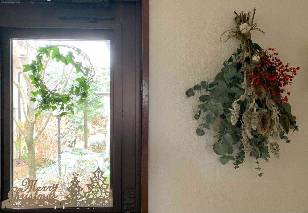 お直ししたスワッグもラムズイヤーの白と南天の実の赤、ユーカリの緑がクリスマスカラーで雰囲気バッチリですね🎄