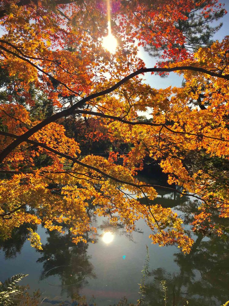まぶしい太陽光☀️を遮る紅葉🍁と反射する池が綺麗でした。📸🥰