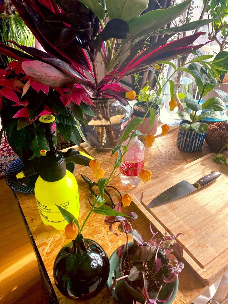 花のあるキッチンを💐と思ってやっていたらgreenが多すぎて🌿🪴料理をするスペースがまな板の上しかなくなってしまった💦皆さんgreenが欲しいけどスペースがない時どうしてますか❓