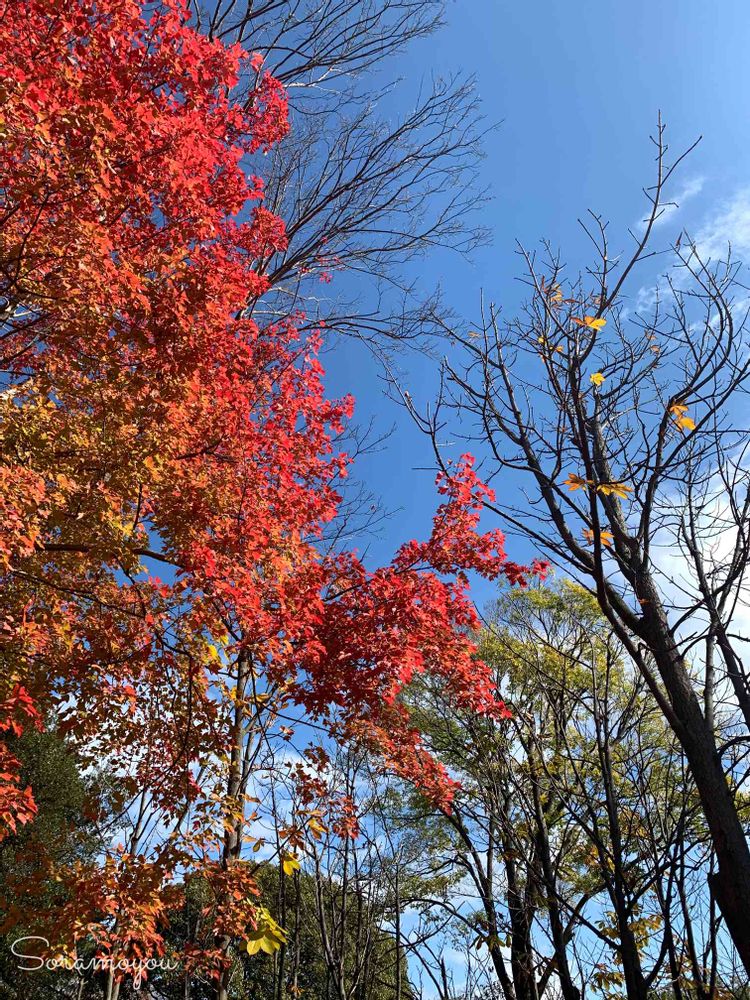落葉が進んでいる樹々の中で鮮やかに紅葉を見せているトウカエデ🍁