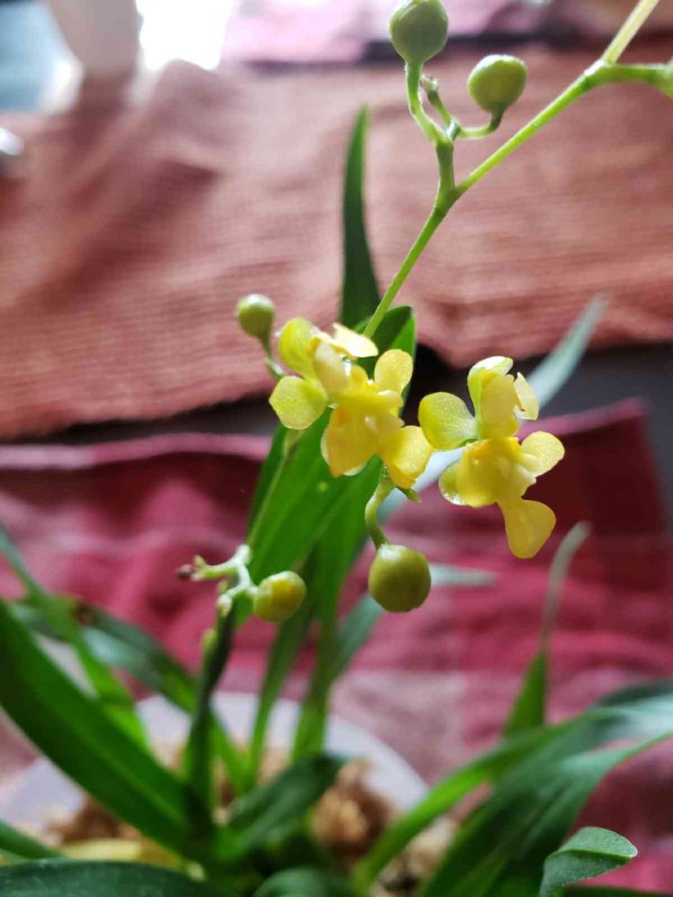 原種の黄色くて小さな可愛いお花です。花芽があがってから結構待たされました😳🌿1本しかあがっていない花芽。だのになのに先端はしけてしまいました😢💦残念😅