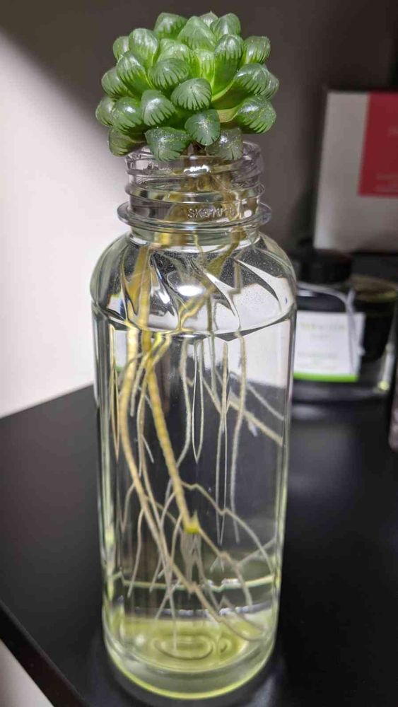 メルカリで買った紫オブツーサをそのままペットボトルに挿して水栽培してたら根が伸びまくって底までついてしまった。子株も出てきてるし分解の仕方を調べないとそろそろバランスが良くない。