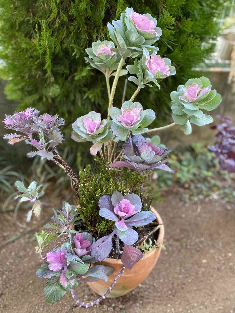 何とか3種類の葉牡丹とカルーナの寄せ植えが出来ました🥺