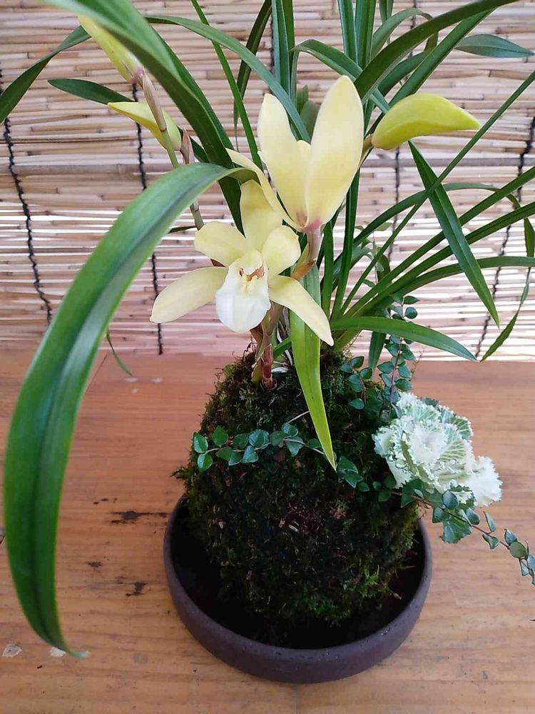 和蘭の苔玉。黄花おぼろ月と葉ボタン
