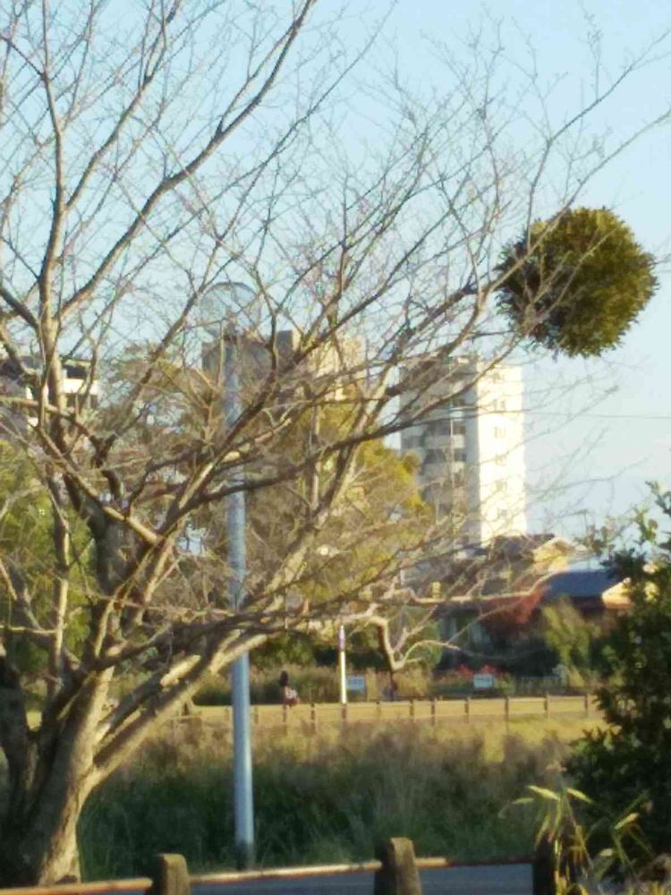その木は落葉して葉っぱがないのですが、細い枝先に丸く葉っぱの大きな球体を茂らせてました。