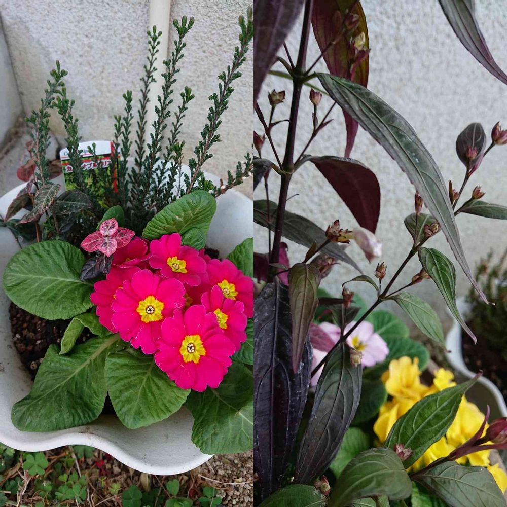 左のハツユキカズラが赤くなりプリムラの赤に負けないくらいになりました✨❤️