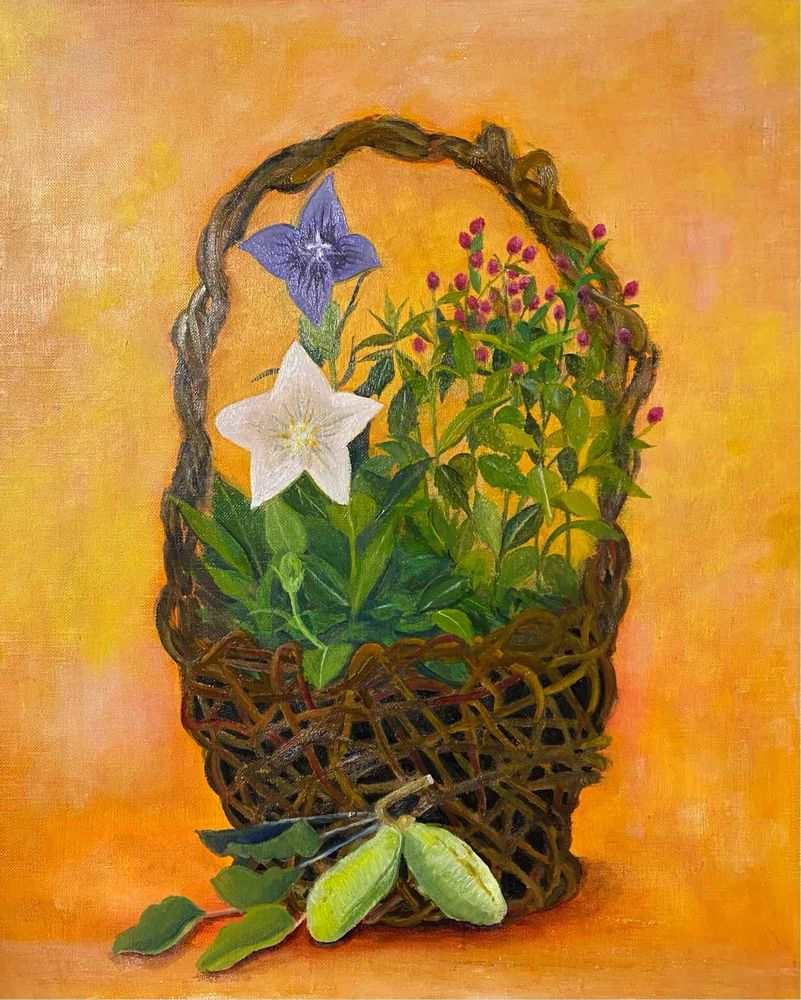 この油絵のモチーフは、絵画クラブでSatchanさんが持参した桔梗てす。