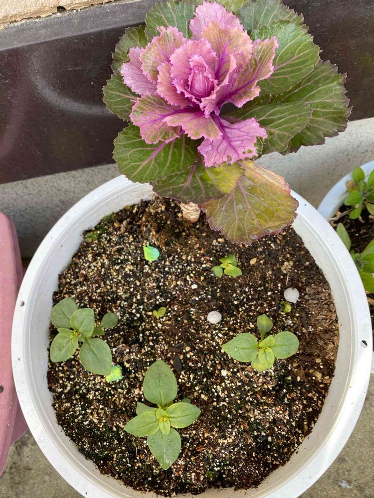 去年からの 葉牡丹に 種からの金魚草 植えました