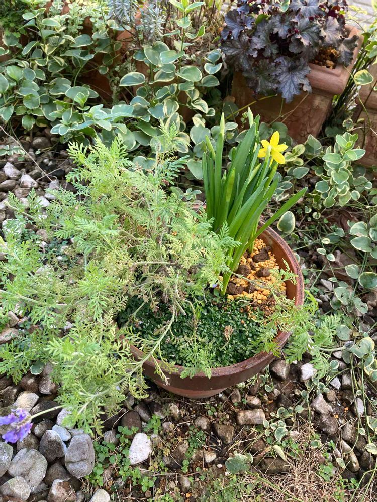 ラベンダーとヒナソウの鉢に水仙を追加しました。