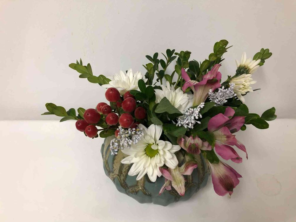 花材: アルストロメリア、中輪菊、ヒペリカム、ツゲ、セイタカアワダチソウ(偽物サントリナ)