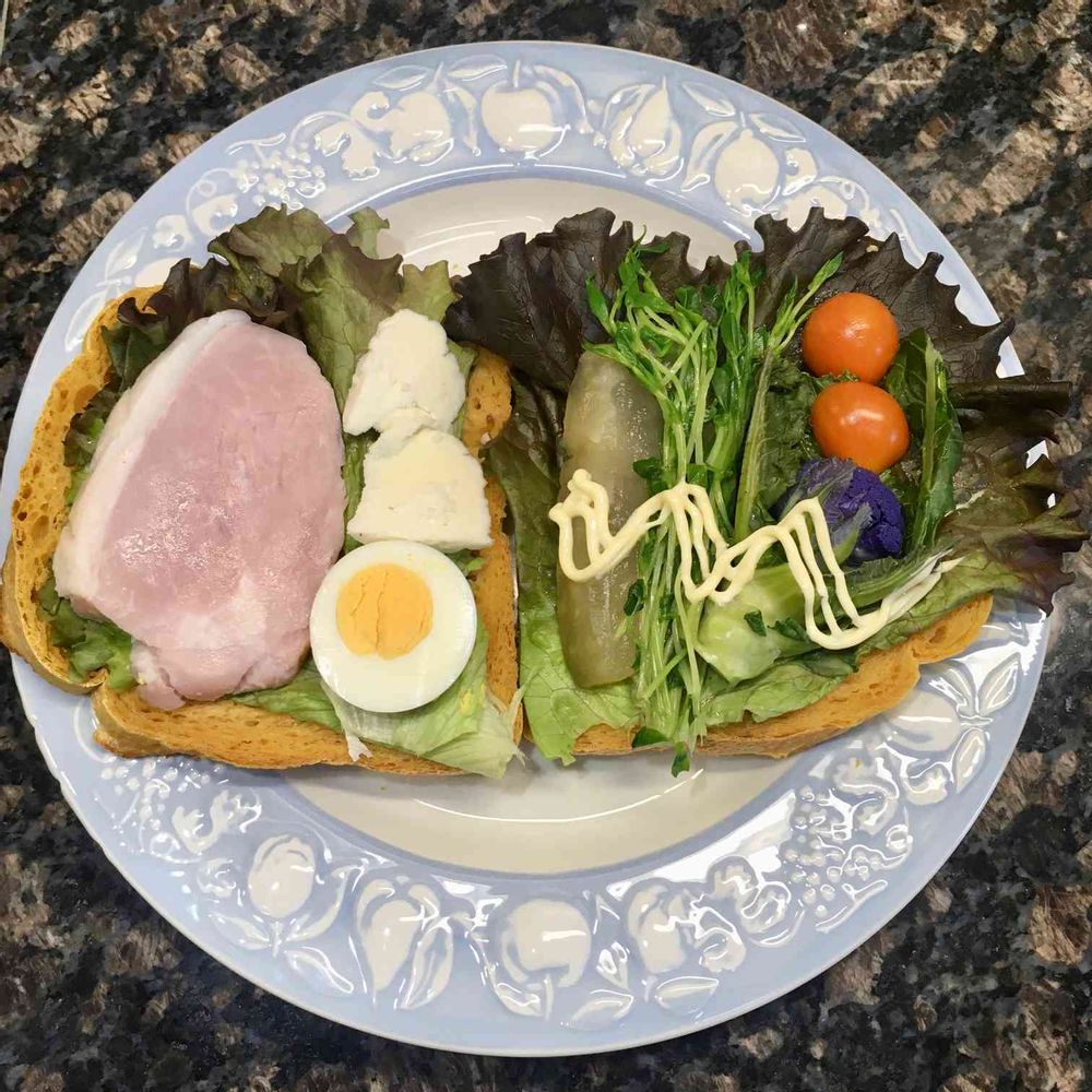サニーレタス、太胡瓜ピクルス、豆苗、ミニトマト、紫ブロッコリーと、ハム、茹卵、自家製チーズのサンドイッチ。鶴首南瓜練り込みパンを使用。