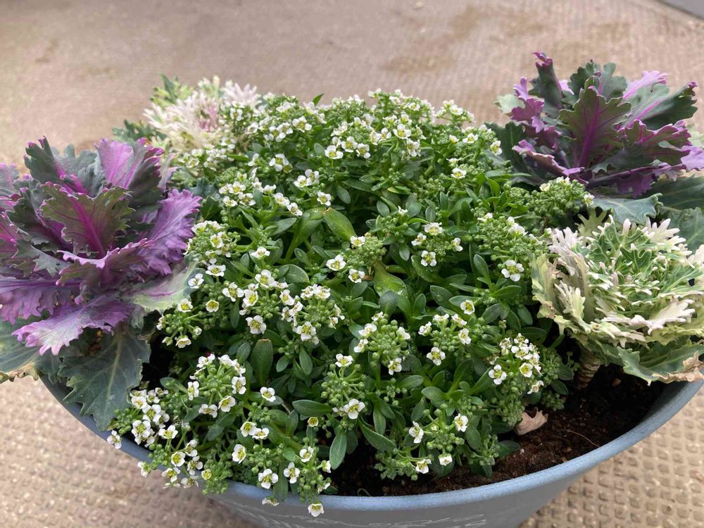 お正月用に寄せ植えしたけど、今年はアリッサムを白だけにしちゃったし、銀龍(葉牡丹)もないし地味になっちゃったかなぁ😅