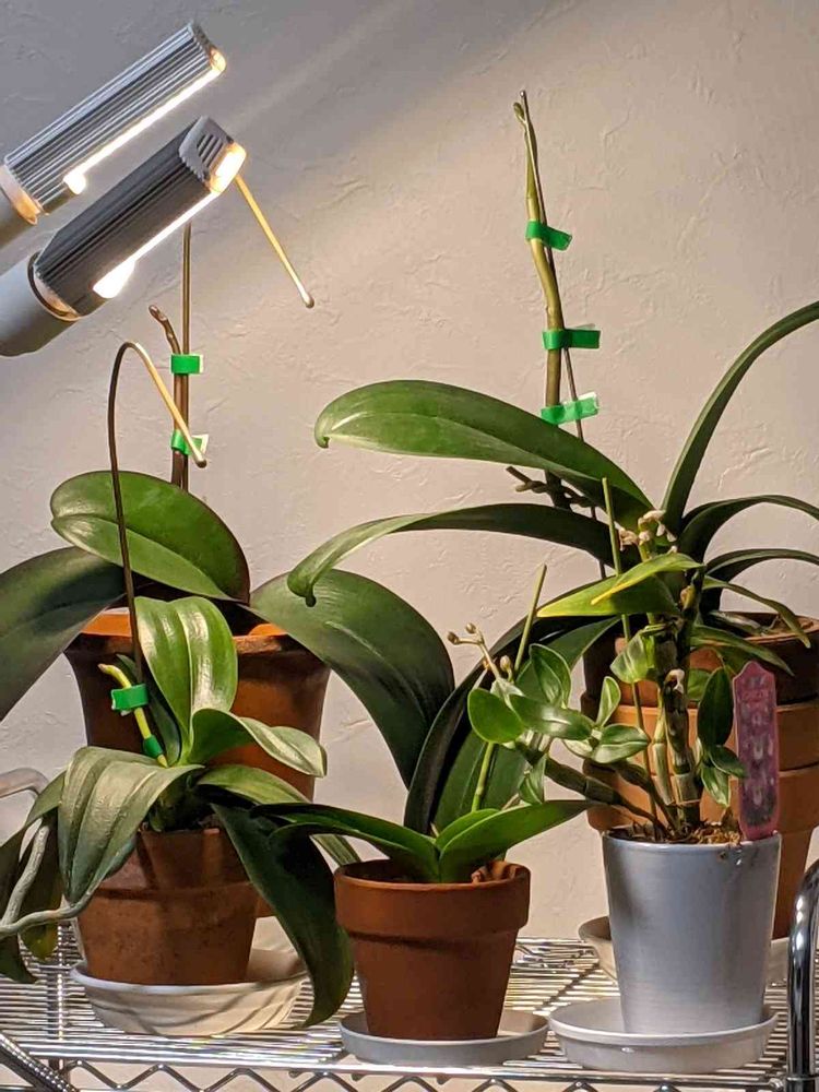 育成ライトで昼間の光量不足を補う。今年は順調に花芽が伸びてる😃マイクロ胡蝶蘭は花芽が2本ずつでてきてるし、贈答品組も太い花芽がスクスク😆なんたって今年は花芽を一本も折ってないんだもーん😤←自慢することか?