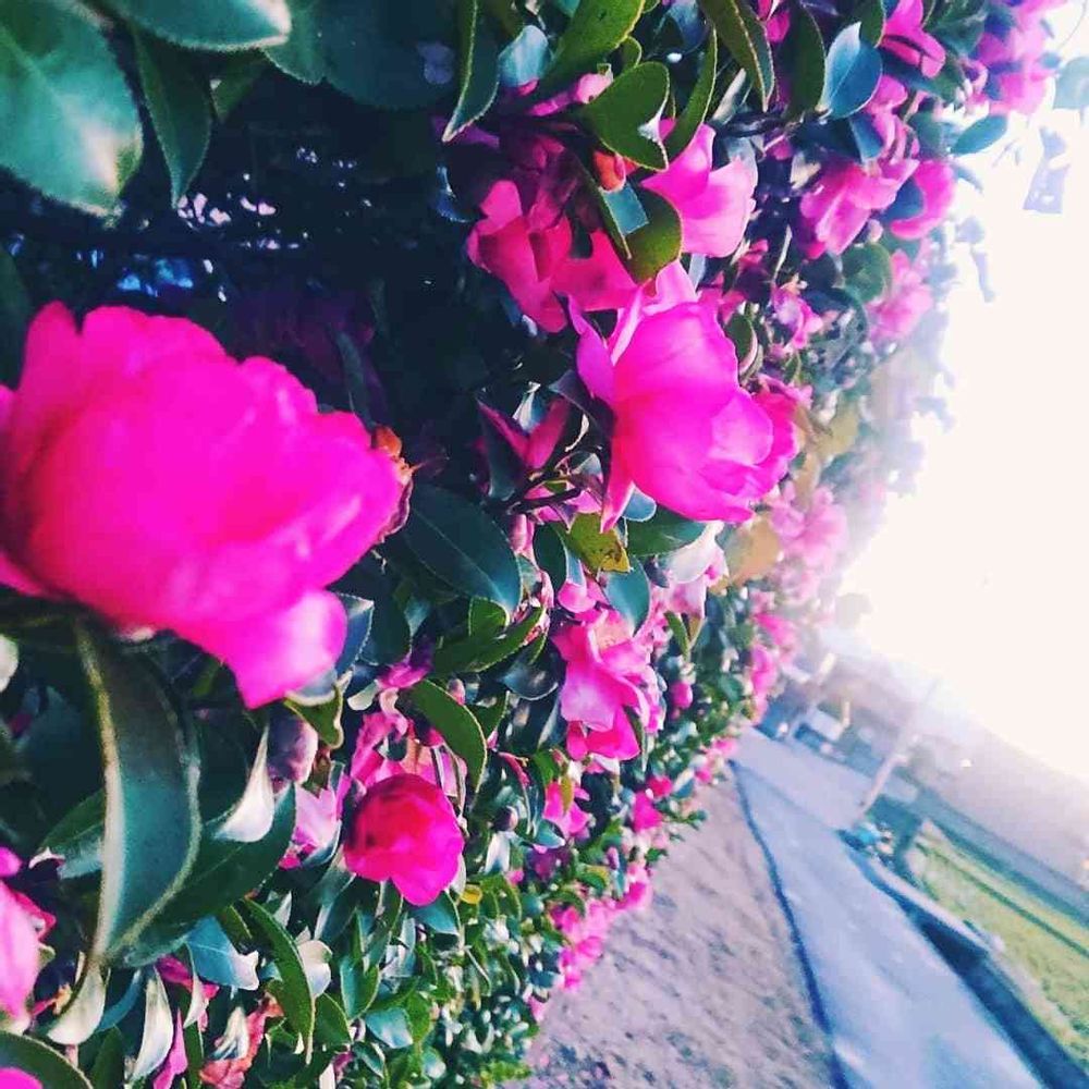 朝、早い時間にお散歩見つけたさざんかの垣根🌸
