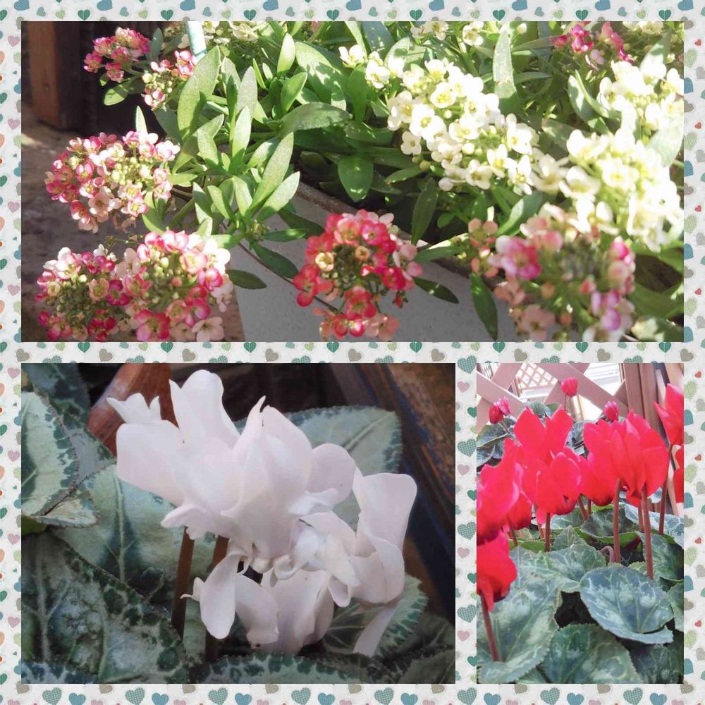 こぼれ咲くアリッサムと、寒さが進んで花数も増えてきたガーデンシクラメンです☺️