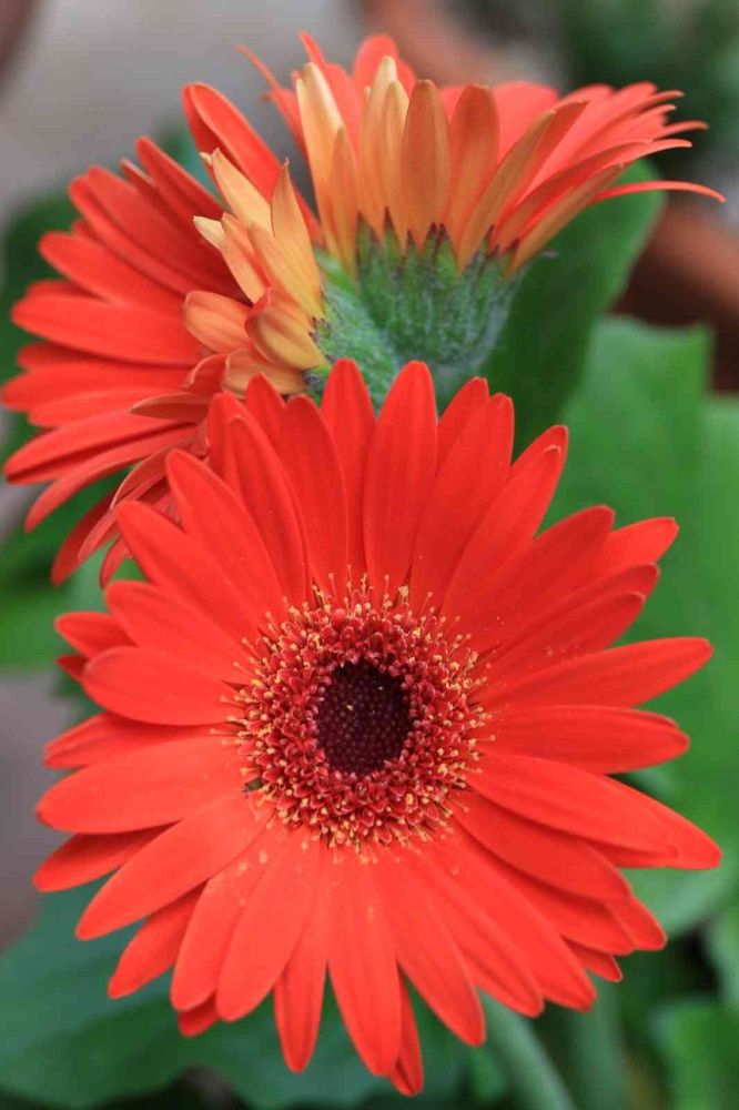 曇り空の下で鮮やかに咲いてるガーベラ🌼🌿赤のガーベラの花言葉は「燃える神秘の愛」🤩💗💕