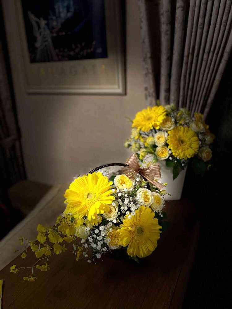 イエロー系の💛🌼花束💐がとっても明るくて、可愛くて、そのアレンジメントもおしゃれに決めていらっしやりしかももう一つ✨❣️❣️❣️