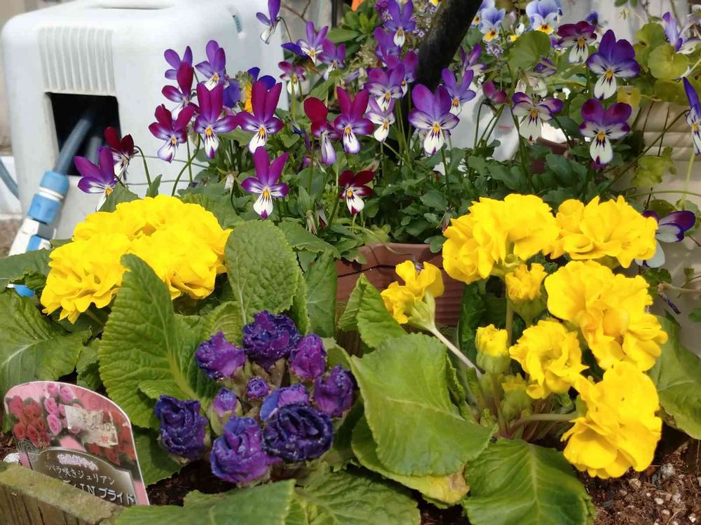 これからお庭を華やかにしてくれる寄せ植えのプリムラ、ビオラたち🎵