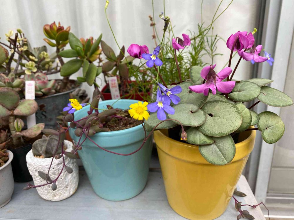後方に置いたロベリア パラシオンブルーが手前ピンクシクラメンと黄色のルビーネックレスにコラボしていい〜感じ😁💙💕💛