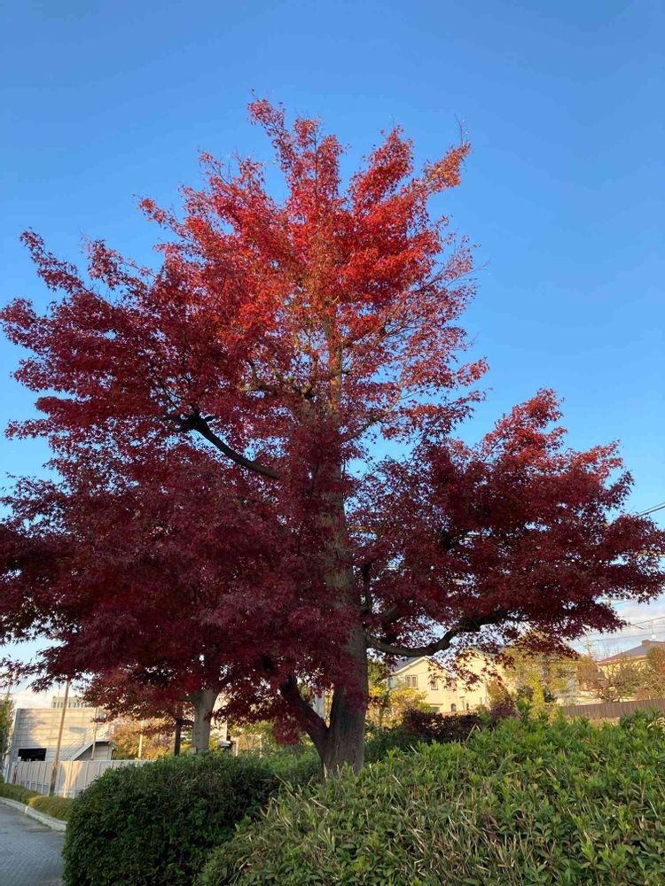 娘夫婦の自宅の定期清掃後JR木幡駅まで戻ってきましたが、ふと前方を見るといつもは通らない道端に真っ赤に色づいたモミジが2本。だいぶんくすんだ色にもなってきている部分もありますが、夕陽に映えてしっかり立っています。