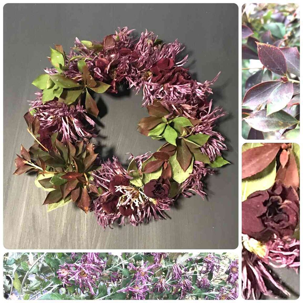 菊の花のリースなんて 初めて見ました。落ち葉の色相とマッチしてて 素敵ですね✨