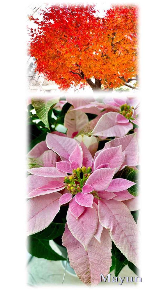 こんばんは😊紅葉もプリンセチアも綺麗ですね✨クリスマスシーズンに赤いポインセチアはよく似合うと思いますが、私はピンクやホワイトのプリンセチアの方が好きです💕