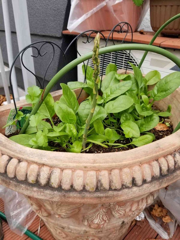 アスパラガスの鉢を間借りしていたちぢみほうれん草