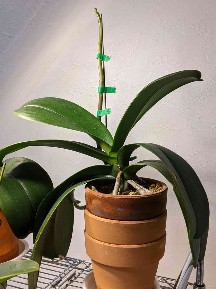 支柱が足りなくなってきた💦葉っぱが棚についてしまうため素焼き鉢を3段重ねで上げ底😅来年植え替えの時は腰高に変えようかな?