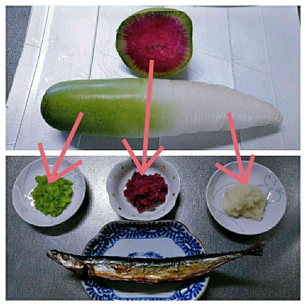 緑色、赤色、白色のそれぞれの大根おろし。いろんな色で味くらべ~。